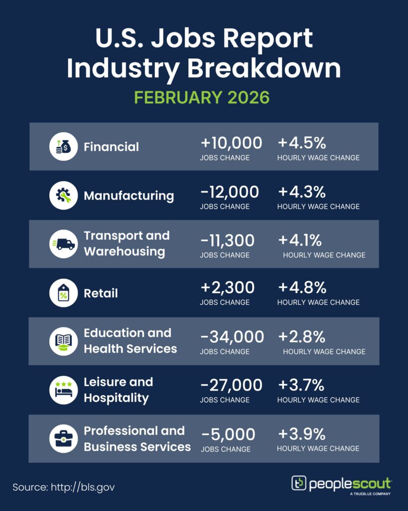 The February 2026 jobs report delivered an unexpected setback for the U.S. labor market, with a net loss of 92,000 jobs, marking the third monthly employment decline in the past five months and reinforcing the slow-growth environment that has characterized hiring over the past year. The unemployment rate edged up slightly to 4.4%, while wage growth remained solid. Several temporary factors contributed to February’s decline—including severe winter weather and a large healthcare strike that sidelined more than 30,000 workers. Still, the report underscores a broader reality employers have been navigating for months: hiring activity across most industries remains limited and highly selective.